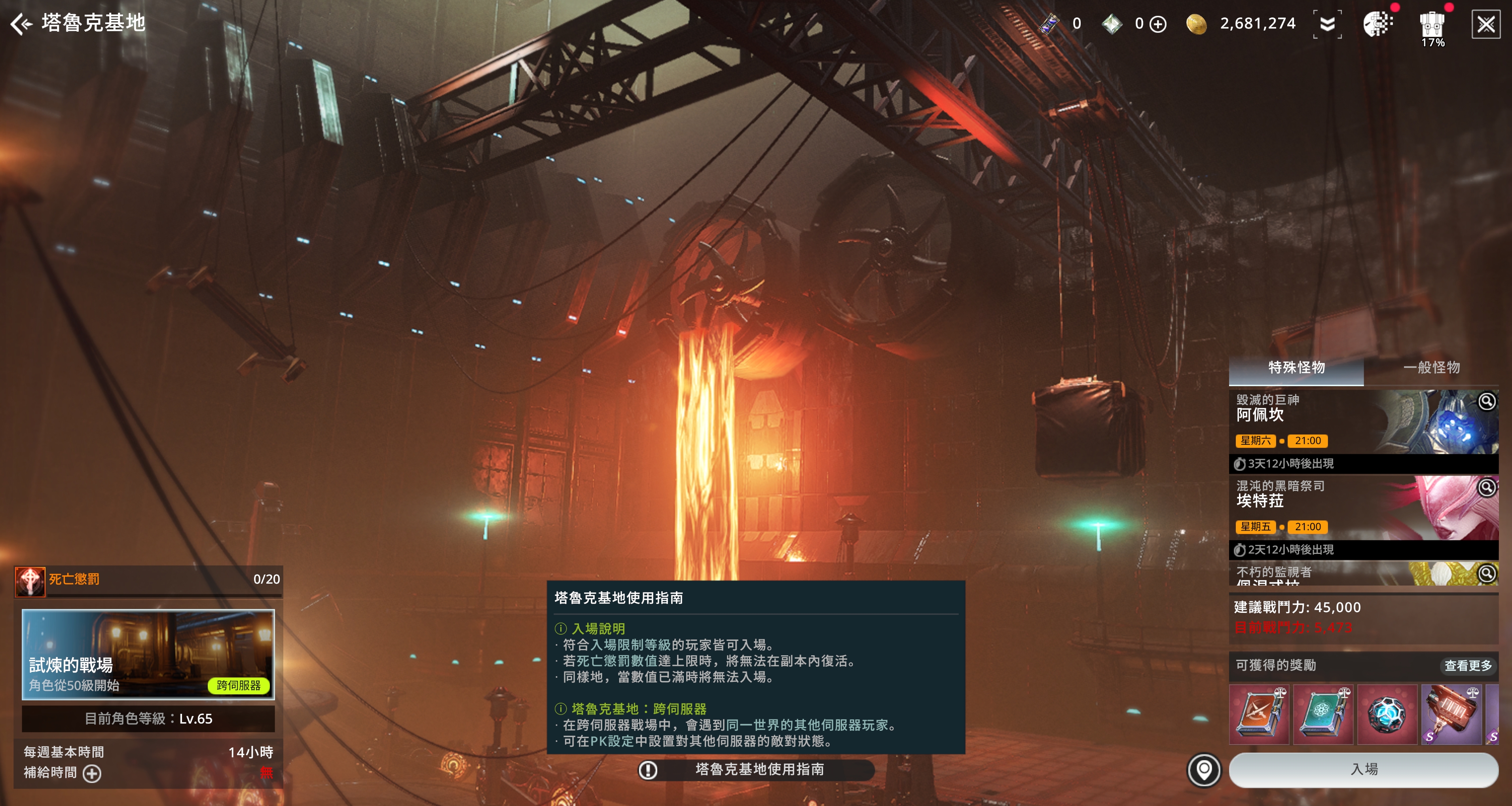 :可透過 [選單 ▶ 競爭 ▶ 塔魯克基地 ▶ 試煉的戰場] 進入。