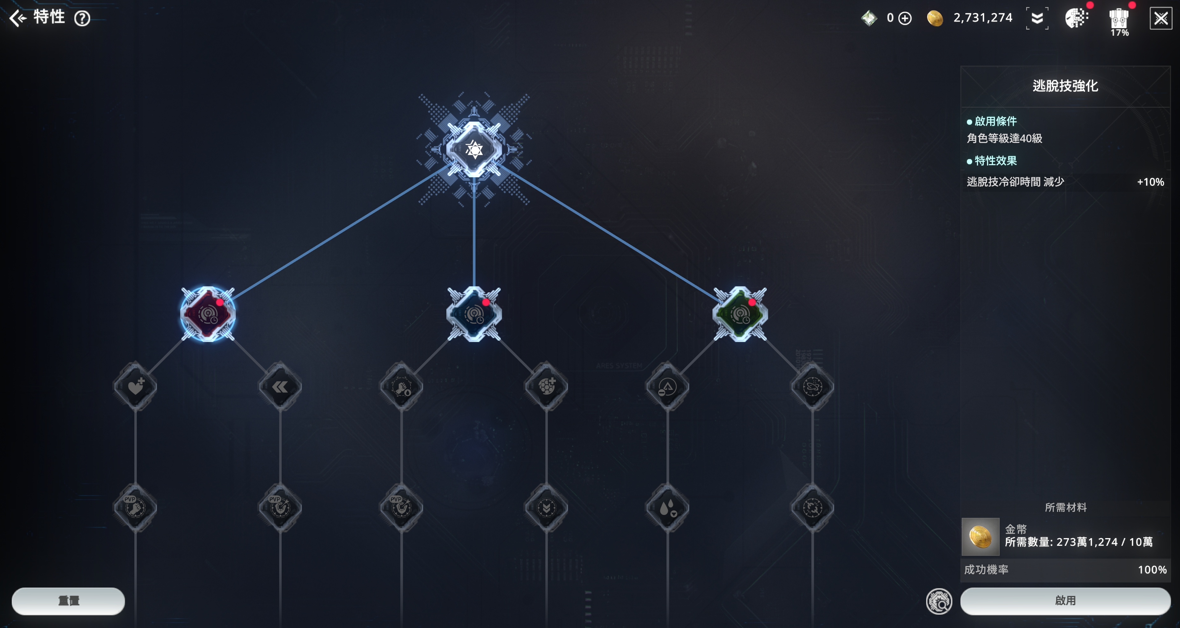 :啟用逃脫技強化增益後,下方左右兩個特性僅能擇一啟用。