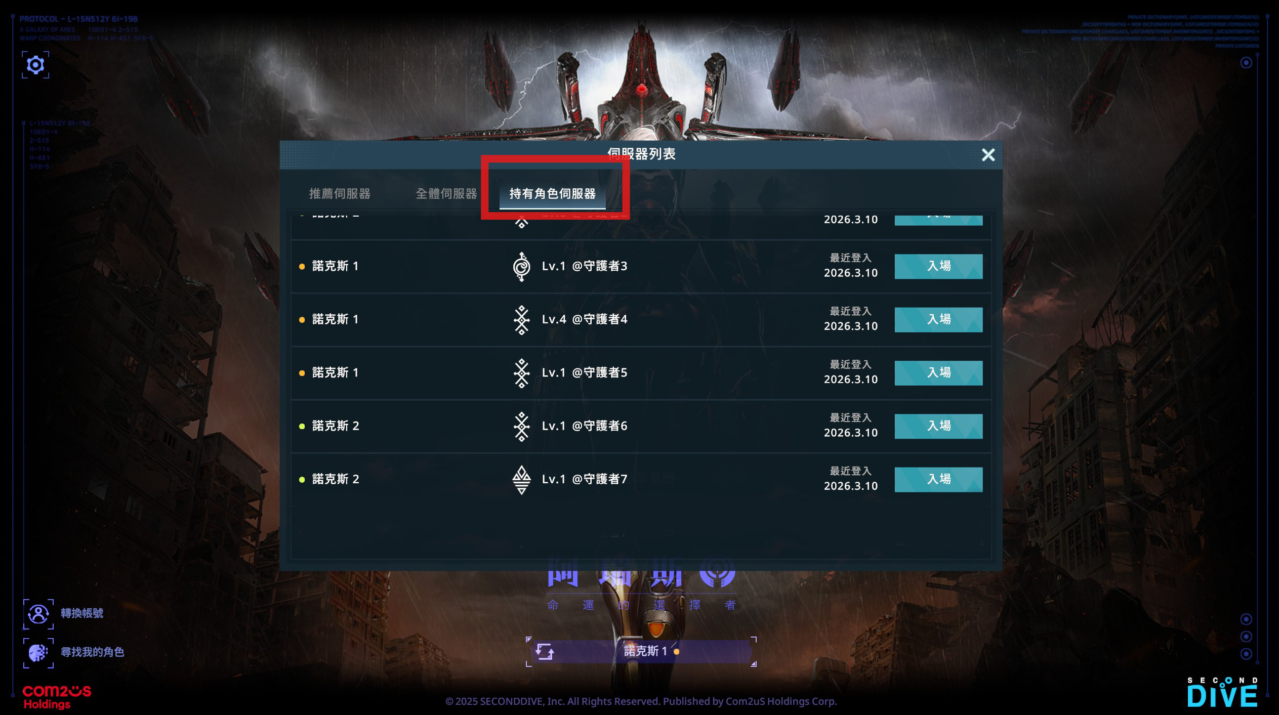 - 伺服器整合前,若帳號內擁有多個角色,登入遊戲後於伺服器列表畫面點擊「角色持有伺服器」分頁,即可查看所有角色及其所屬伺服器。